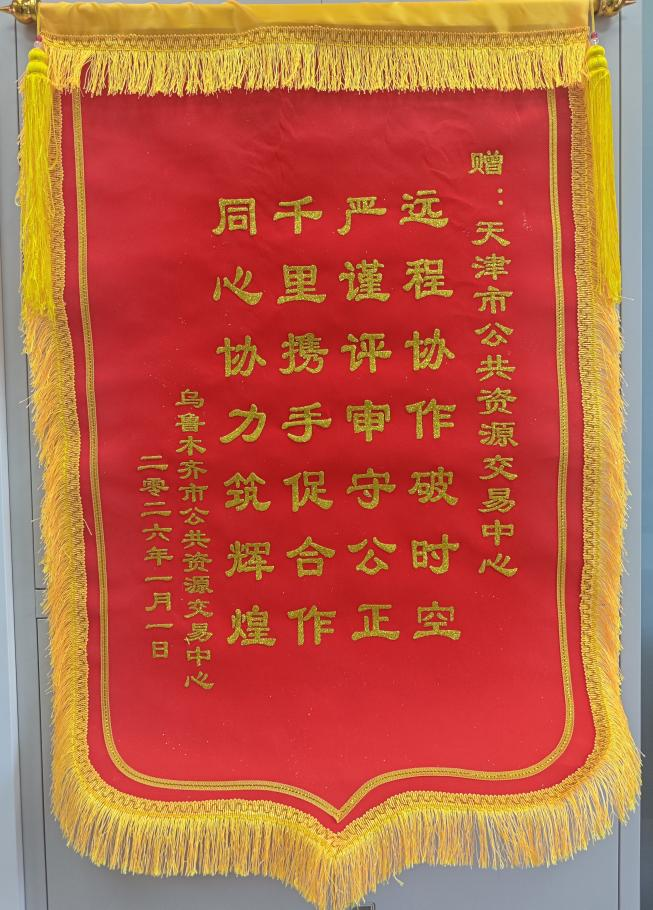 近日,乌鲁木齐市公共资源交易中心向天津市公共资源交易中心专程送来锦旗和感谢信,对天津市公共资源交易中心在远程异地评标合作中给予的协作支持表示感谢。