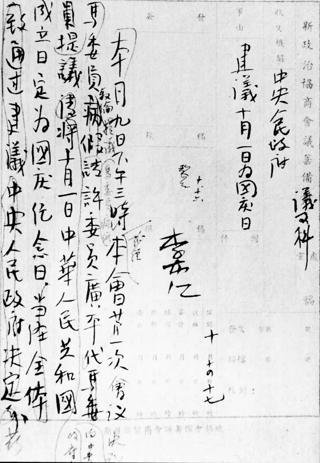 许广平代表马叙伦建议中央人民政府定10月1日为中华人民共和国国庆纪念日。